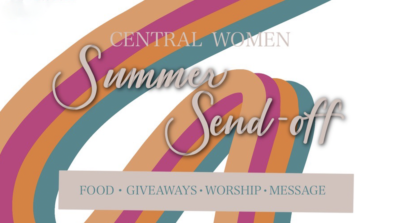 Back to All Events Central Women Summer Sendoff Friday, May 20, 2022 6:30 PM 8:00 PM Central Assembly (Multipurpose Hall) 1301 North Boonville Avenue Springfield, MO, 65802 United States (map) Google Calendar ICS We can’t wait to see all of our Central Women at this great Summer Send-off event. We’ll have great food, exciting giveaways, powerful worship, and a great message from our new Central Women director, Janet Gause.