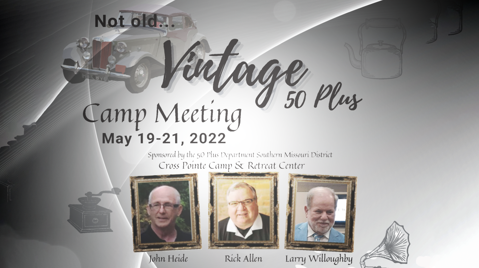 Enjoy great services, fellowship, food, workshops, singing… and wear vintage! We invite Central’s Legacy Senior Adults Community to the SoMo Camp Meeting at the Cross Pointe Camp & Retreat Center. Featured speakers are John Heide, Rick Allen, and Larry Willoughby. Additional information can be found at somoag.org.