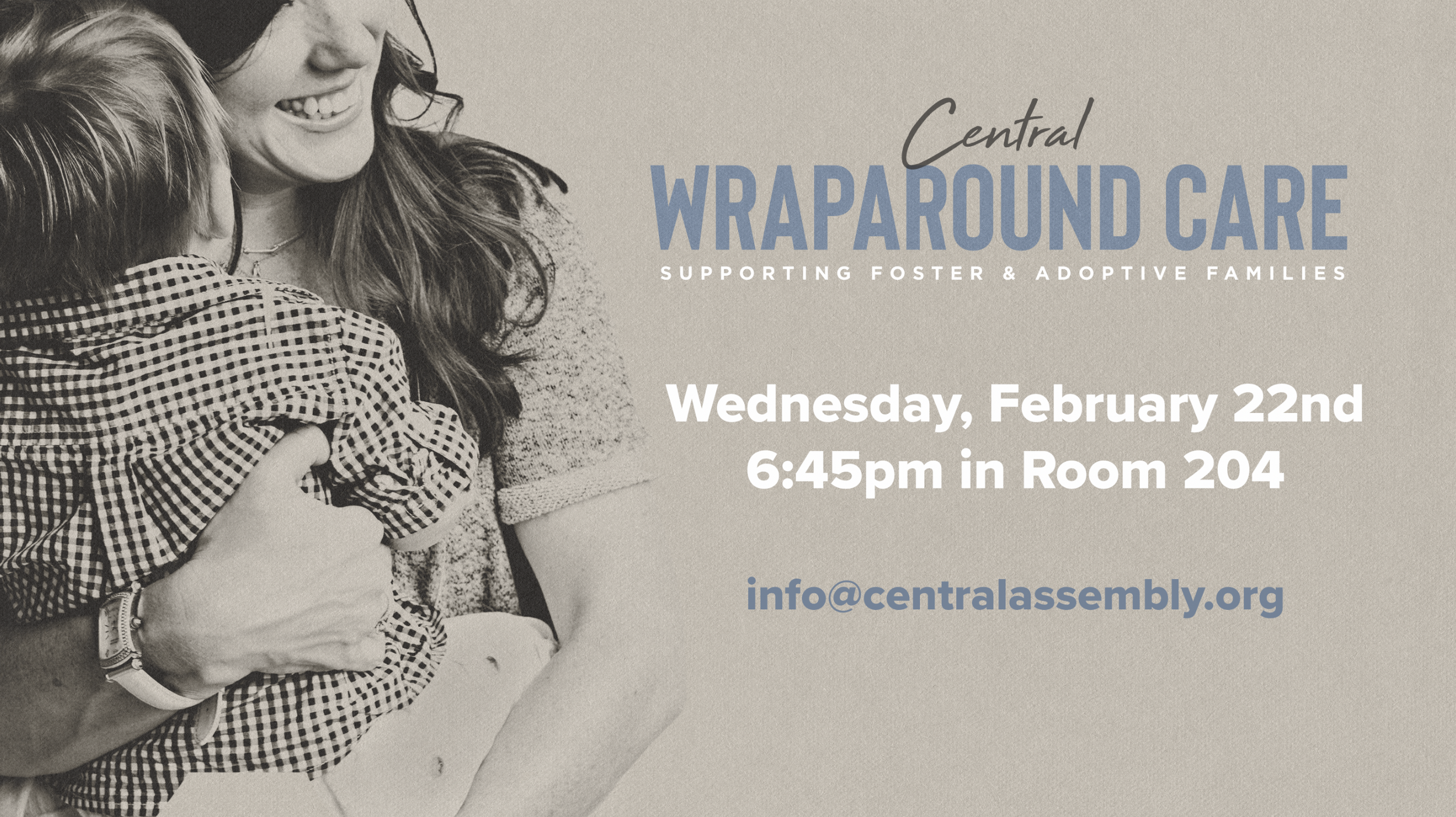 Wraparound Care Wednesday, February 22, 2023 6:45 PM 8:00 PM Central Assembly (Room 204) 1301 North Boonville Avenue Springfield, MO, 65802 United States (map) Google Calendar ICS If you are a foster parent, an adoptive parent, or are caring for children who live away from their biological families, we want to support you! Join us Wednesday, February 22 at 6:45pm in Room 204 for a time of connecting with other families!